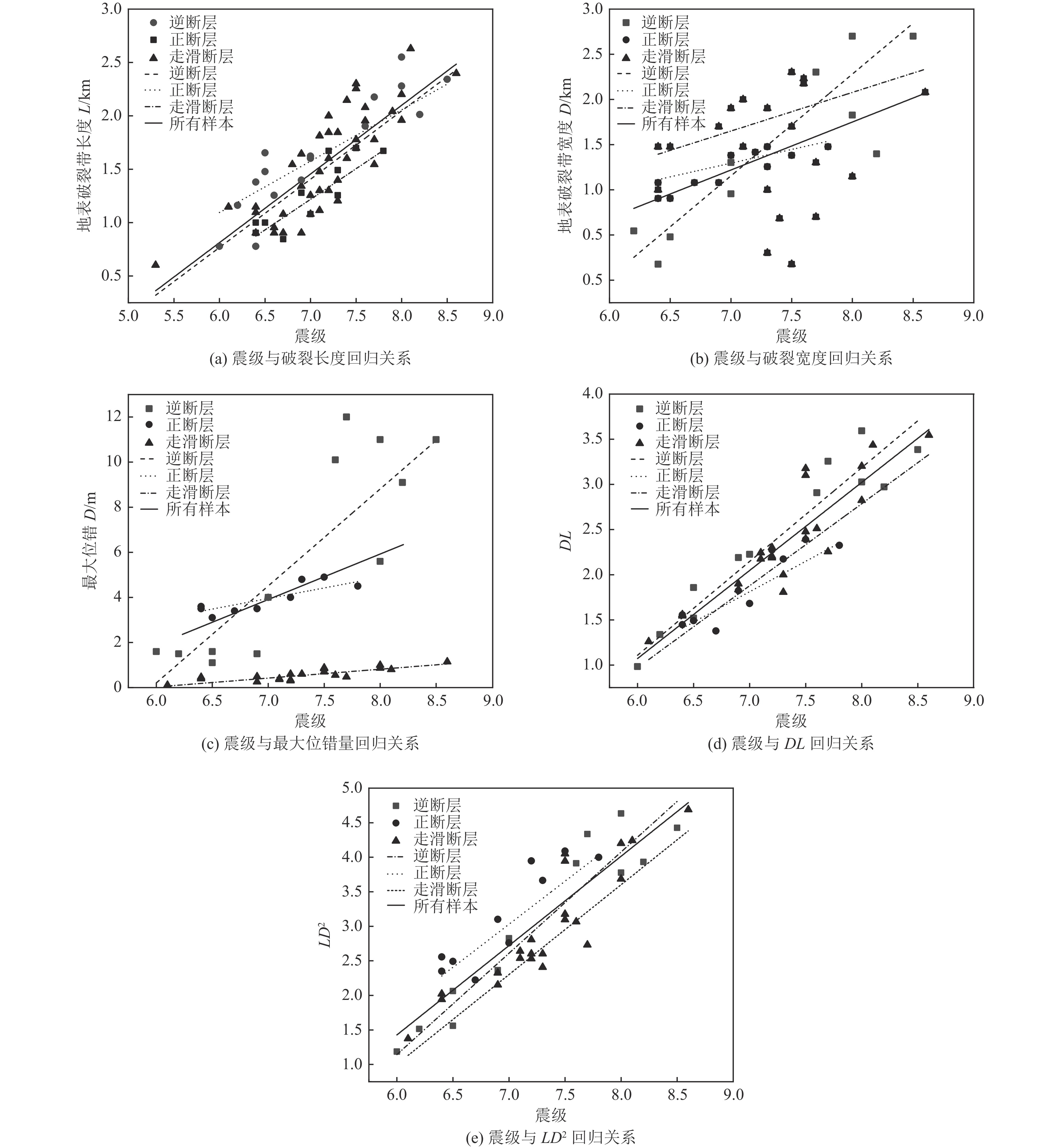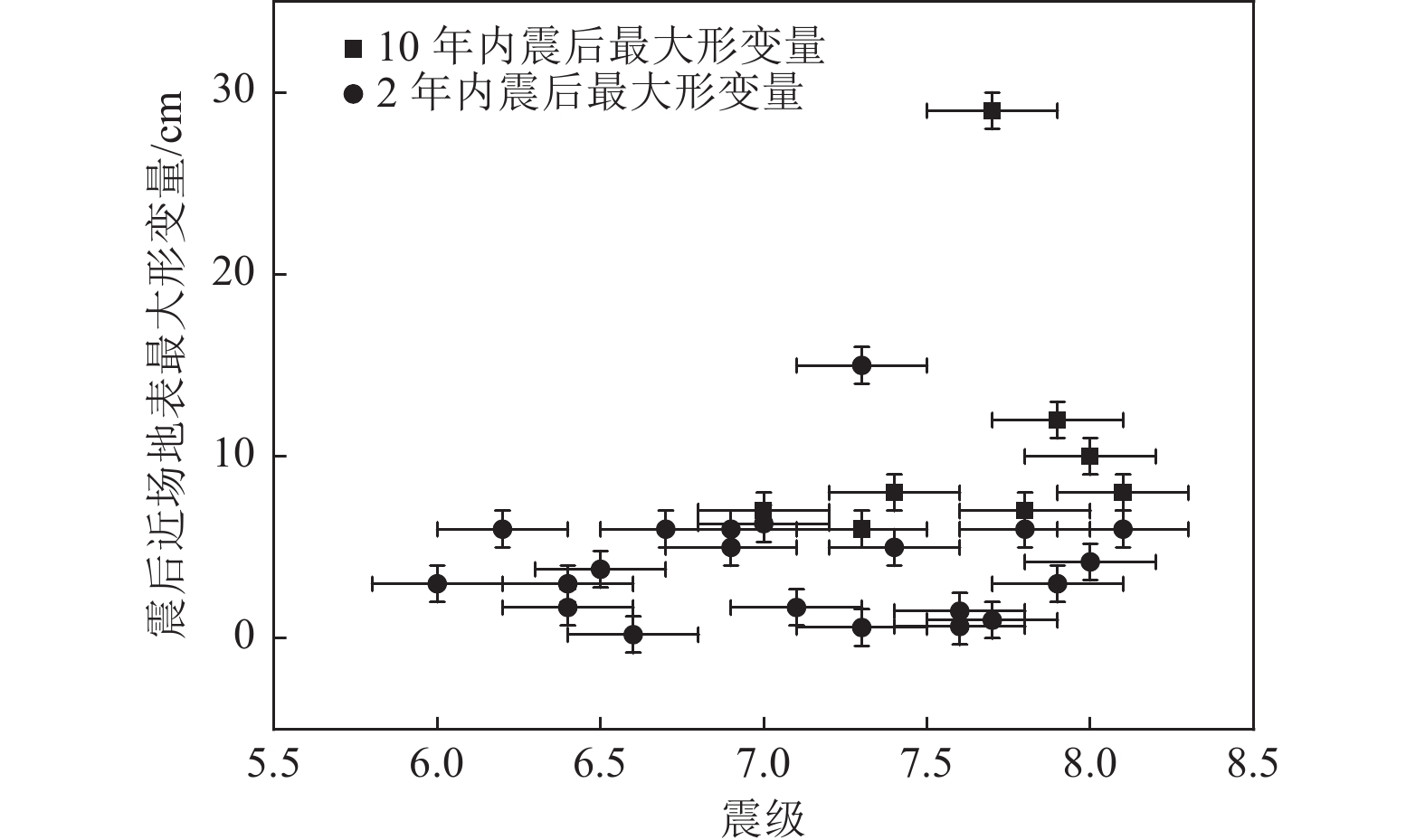 地震地表变形会对基础设施造成巨大破坏,如何减轻其造成的破坏,成为设计人员关注的重点。本文在整理我国自1900年以来有同震地表破裂的地震案例基础上,将数据分为逆断层型、正断层型与走滑断层型3类,分别进行最小二乘法分析,得到不同断裂类型的震级与地震破裂参数及其位移量之间的关系,同时针对我国西部地区震级与地震破裂参数的回归关系式进行了讨论;并对搜集到的我国21例震后地表形变监测数据进行讨论。结果显示,同震阶段的拟合公式相关系数较大,标准偏差较小,所得经验关系更接近中国地质实际情况;震后2年内近场形变量大多位于5~7 cm、震后10 年内近场地表形变量大多位于8~10 cm;说明可以定量及半定量的分析同震、震后破裂参数,为地震易发区穿越潜在活动断层的基础设施设计以及安全性评价提供参考依据。