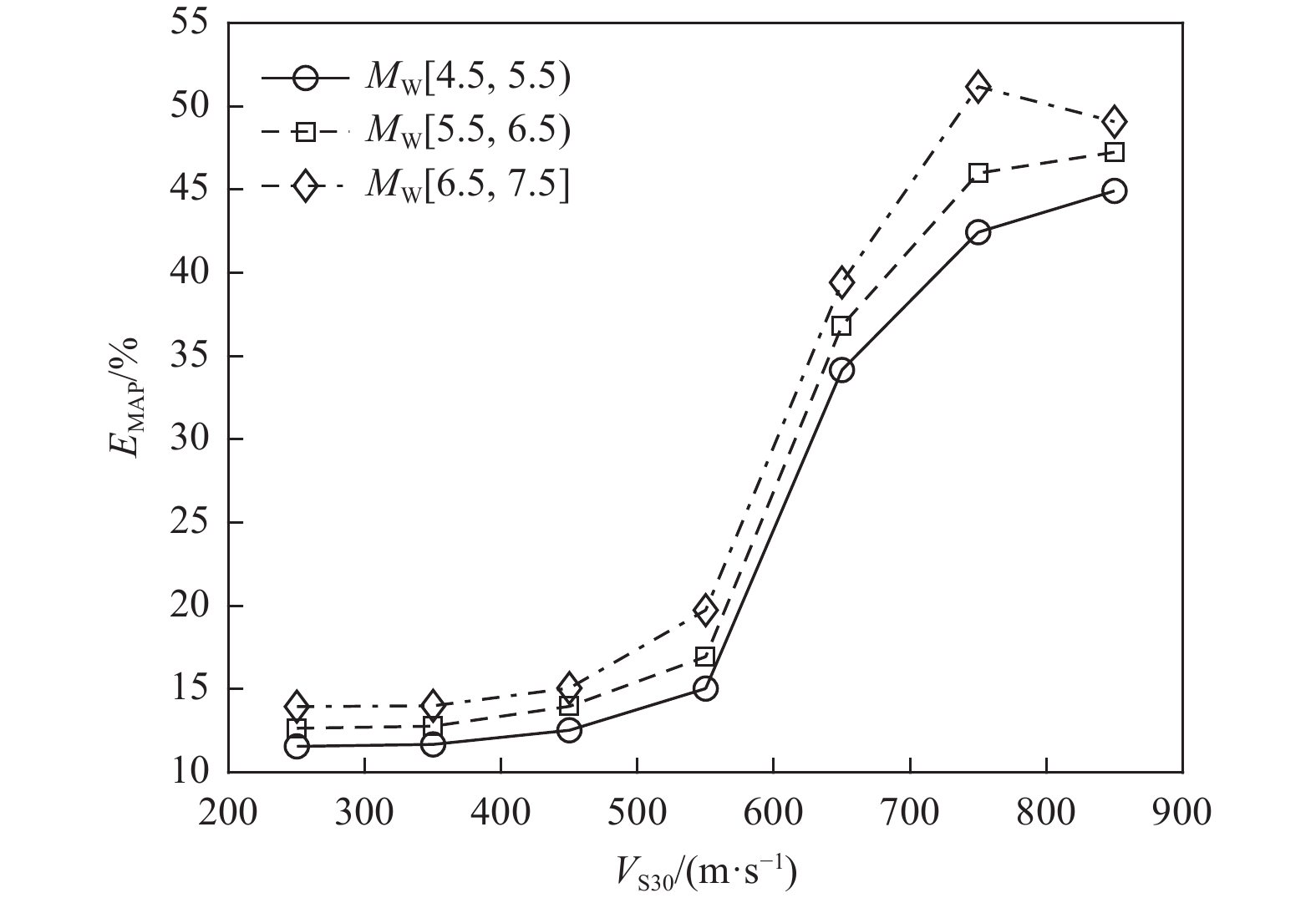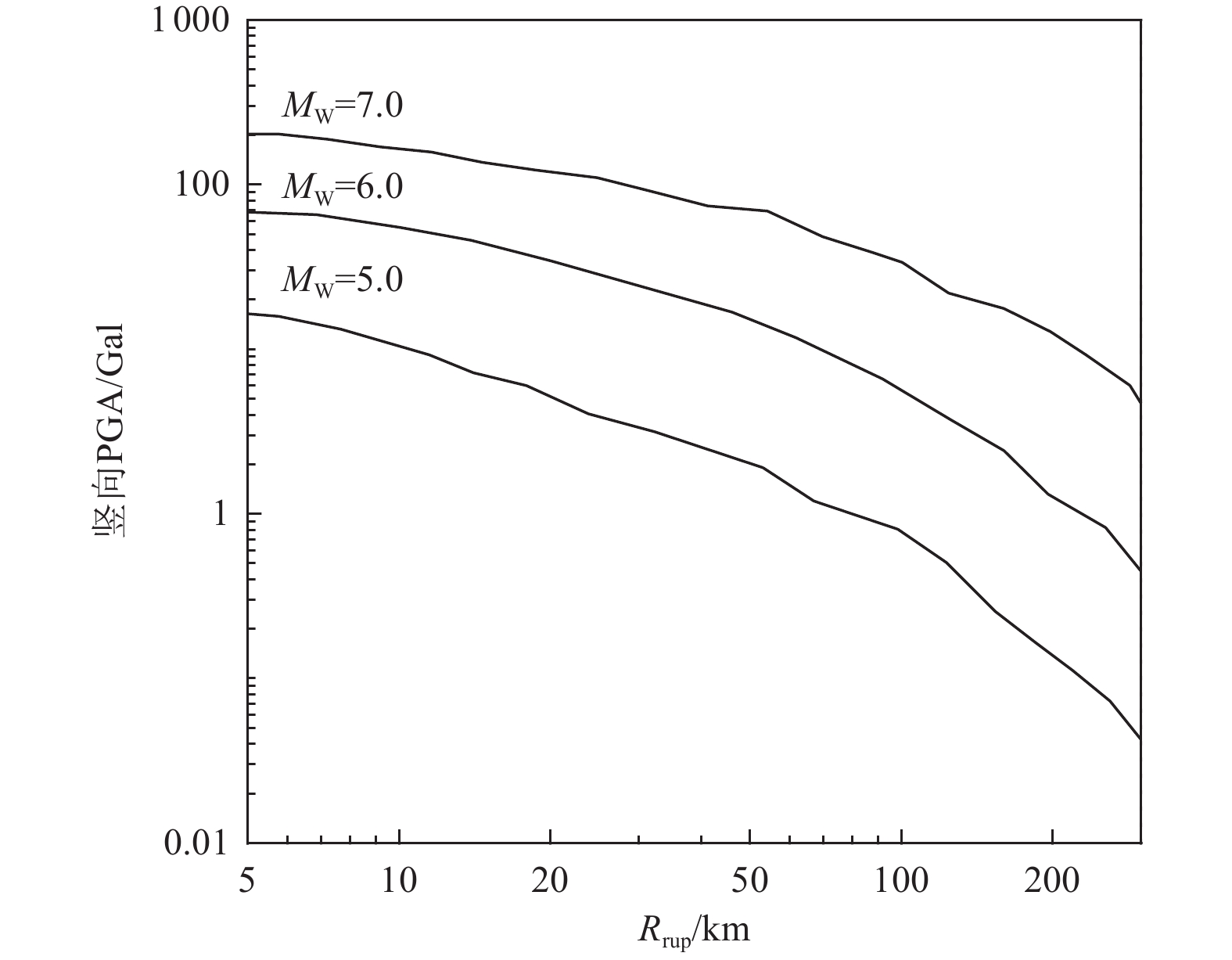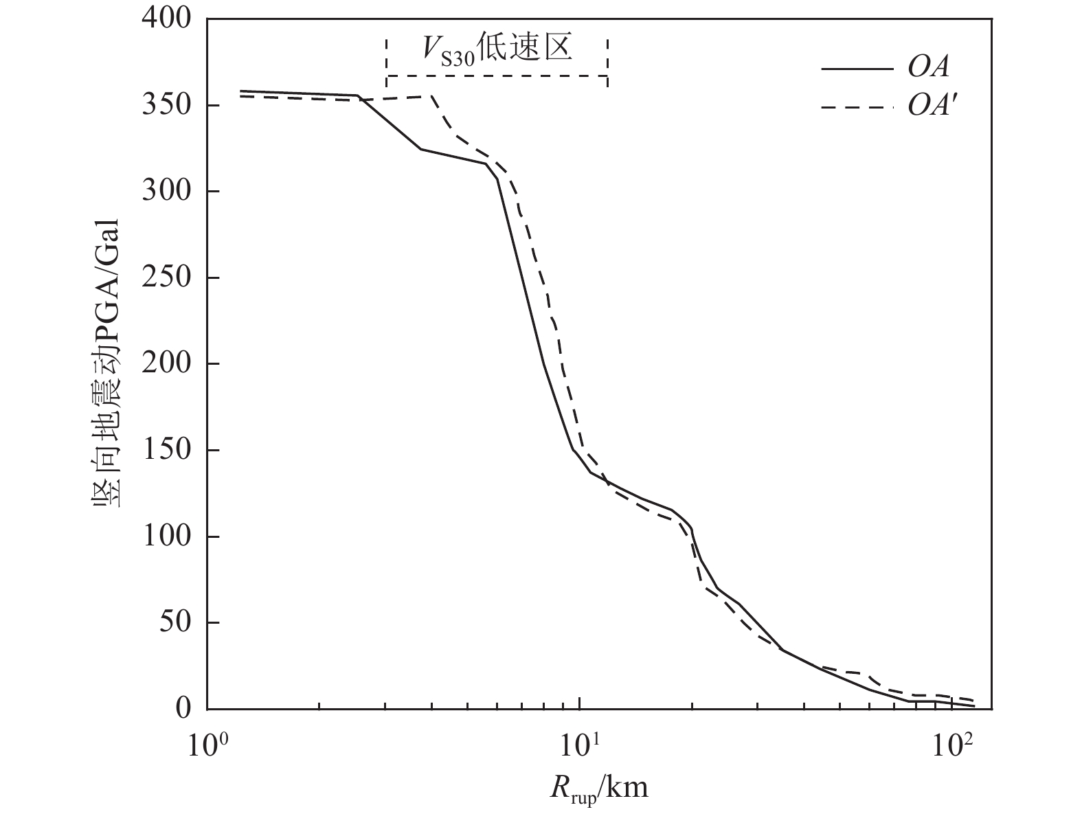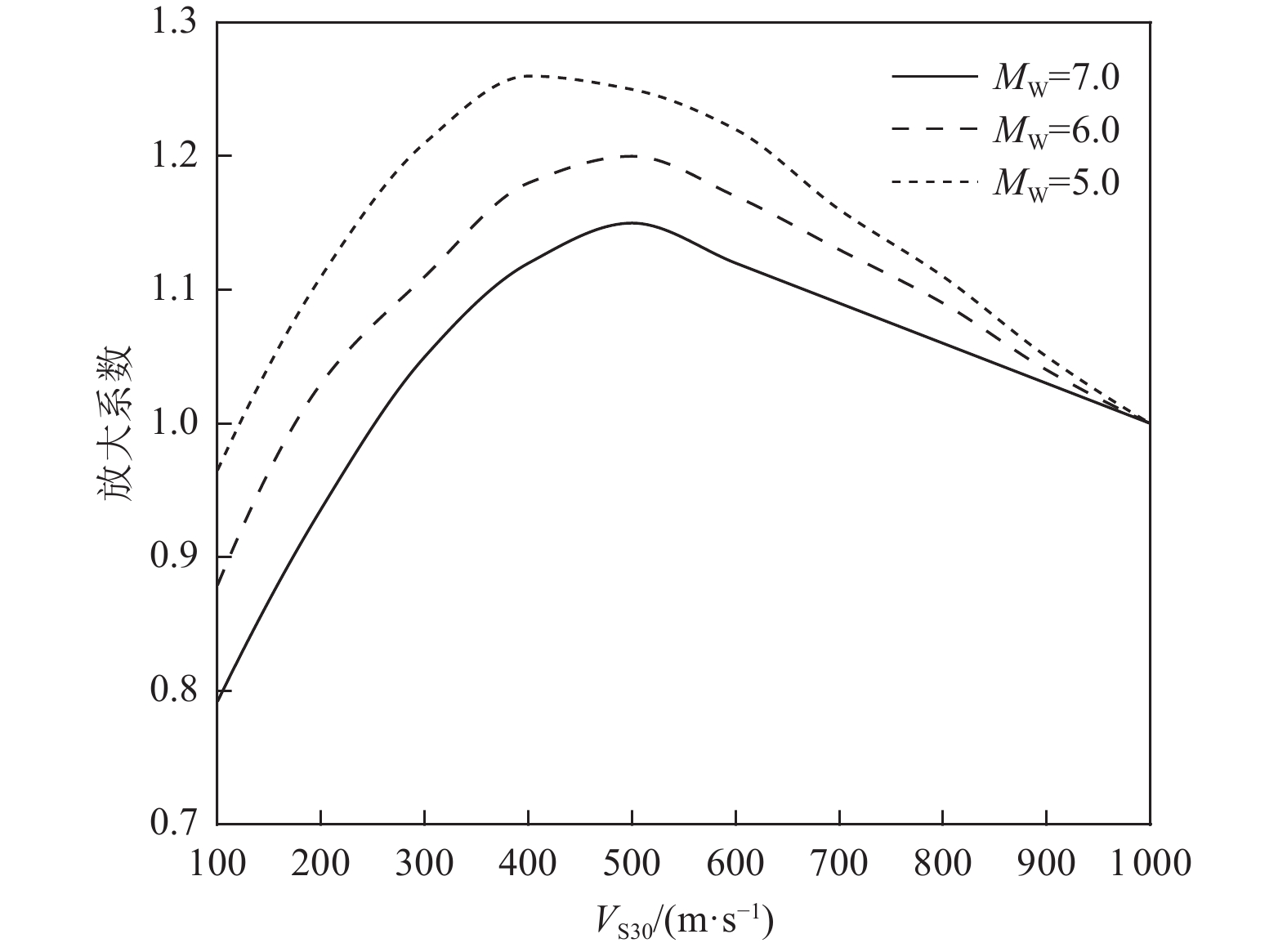 的不断降低,竖向PGA相对于基岩场地的PGA最大放大倍数约为1.14~1.27;大震条件(MW=7.0)下软土场地(\begin{document}$ {{V}}_{{{\mathrm{S}}30}} $\end{document} ![]()