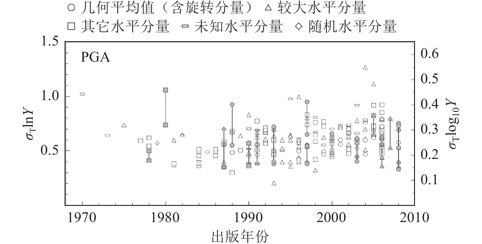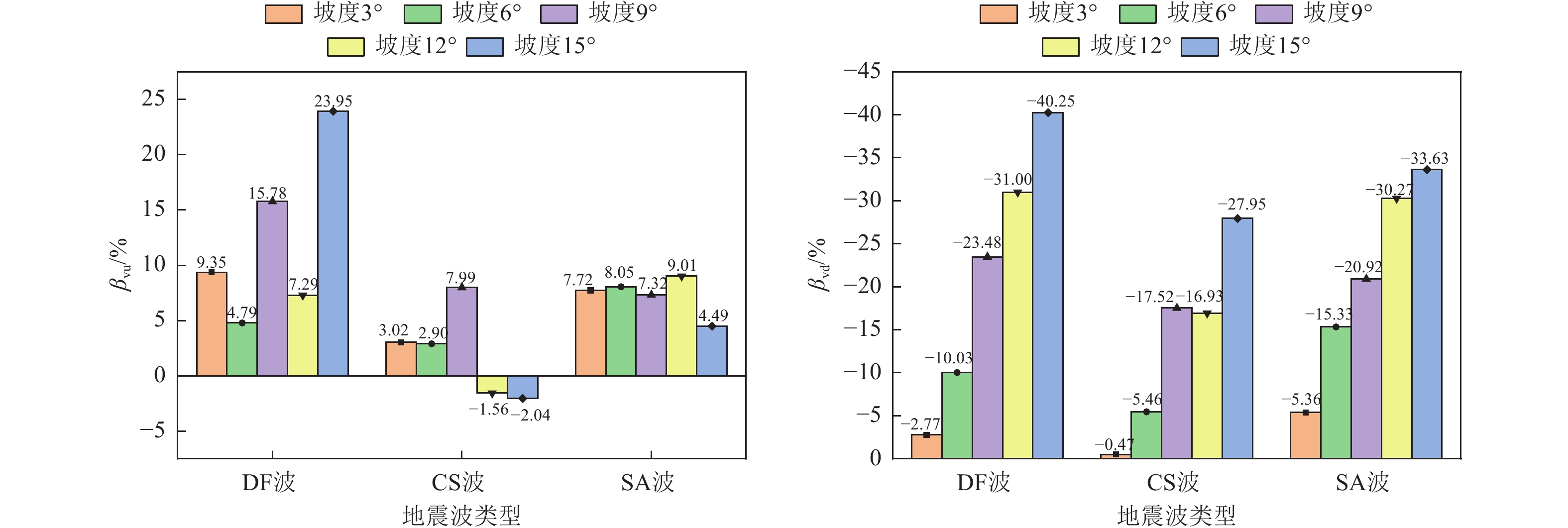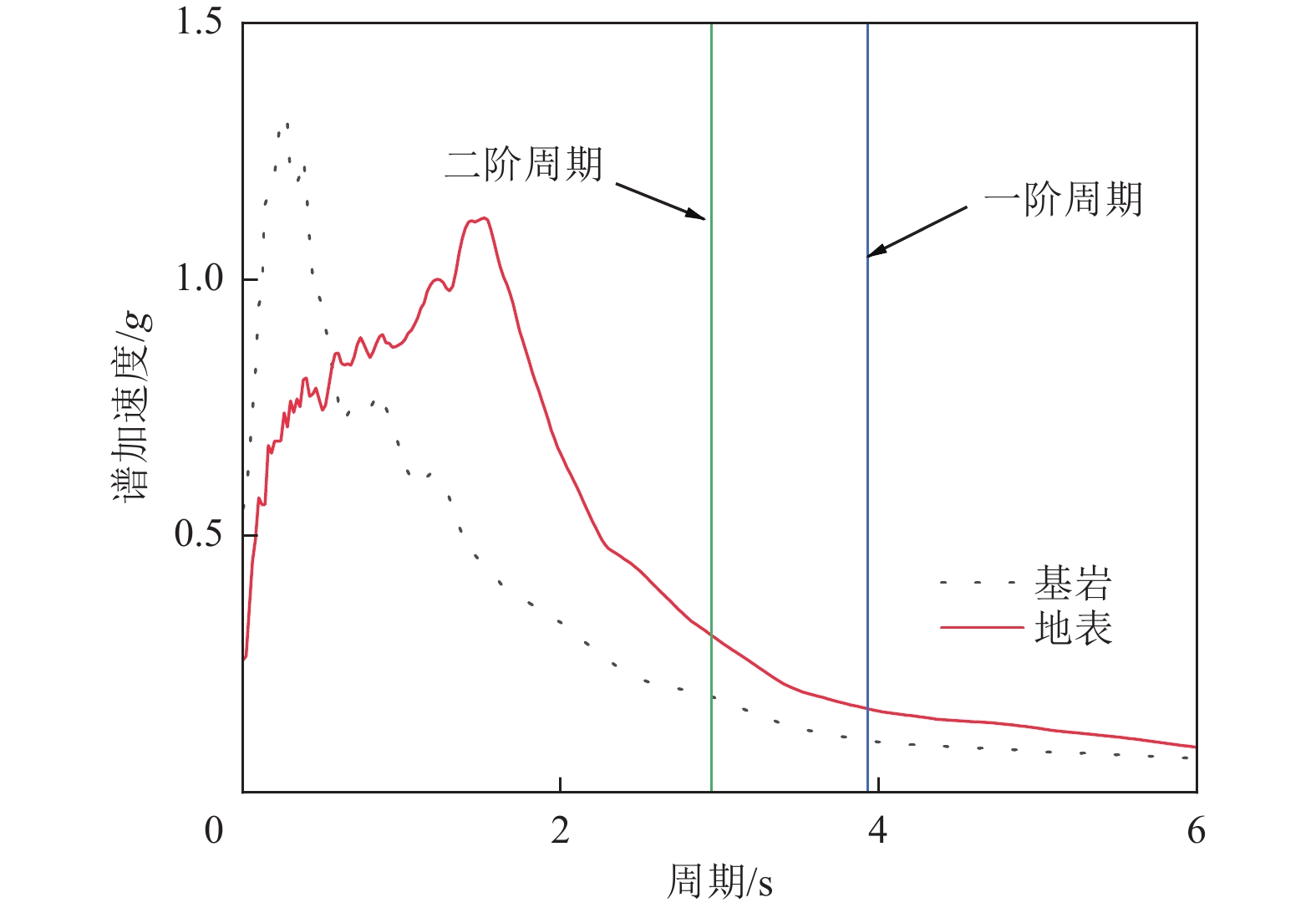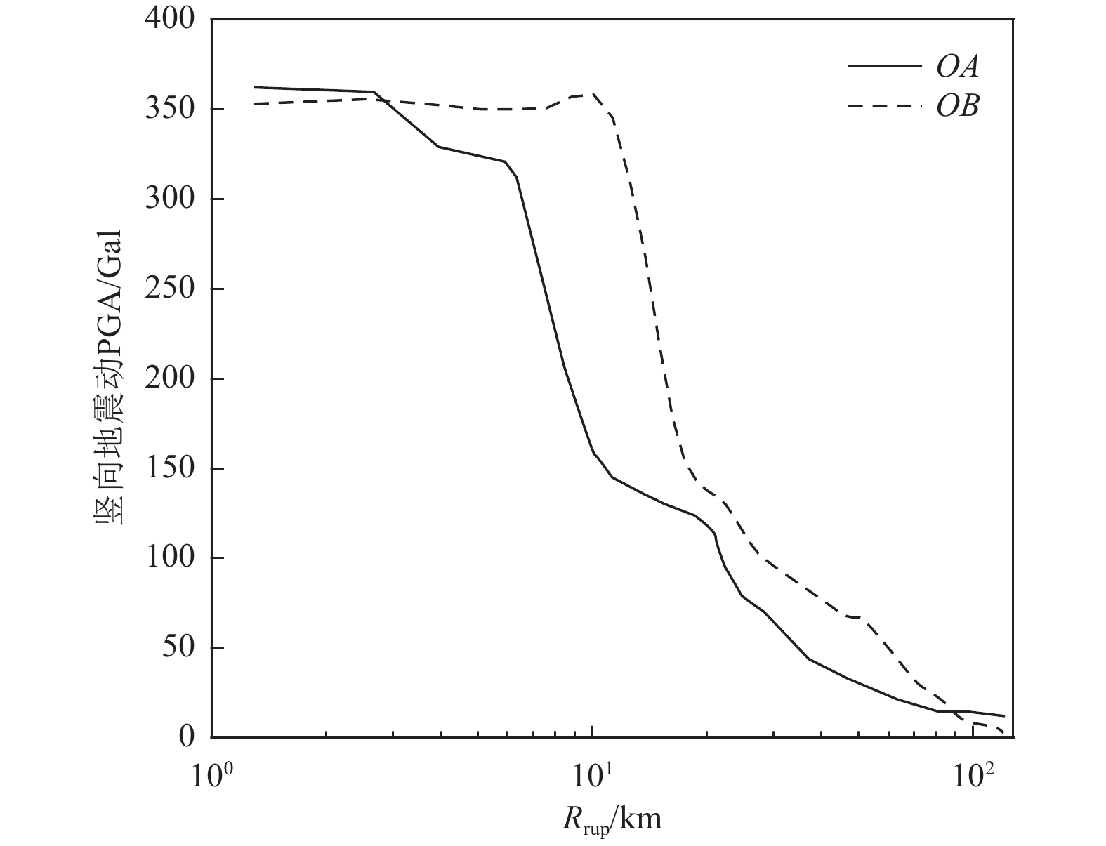 的不断降低,竖向PGA相对于基岩场地的PGA最大放大倍数约为1.14~1.27;大震条件(MW=7.0)下软土场地(\begin{document}$ {{V}}_{{{\mathrm{S}}30}} $\end{document} ![]()