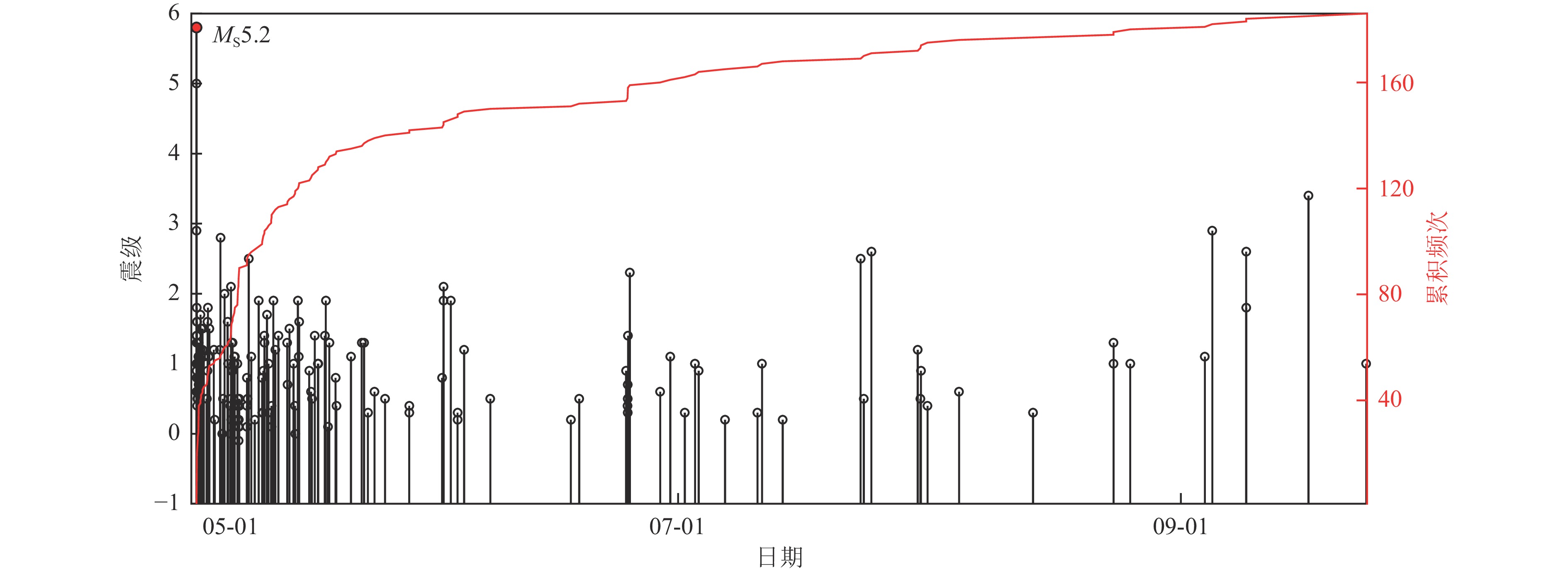 本文基于云南省区域数字化地震监测台网地震观测报告和云南台网区域地震波形数据,结合双差定位方法、CAP方法、川滇地区高分辨率速度模型和流体扩散模型,深入分析了2023年云南保山MS5.2地震的发震断层和成因。双差重定位结果显示,云南保山MS5.2地震沿NW向呈条带状分布,震源深度主要集中在4~12 km。震源机制解反演结果表明,云南保山 MS5.2主震2个发震断层面参数为:节面Ⅰ,走向51°,倾角78°,滑动角−34°;节面Ⅱ,走向149°,倾角56.8°,滑动角−165.6°。根据流体扩散模型拟合得到水力扩散系数\begin{document}$ D $\end{document} ![]()