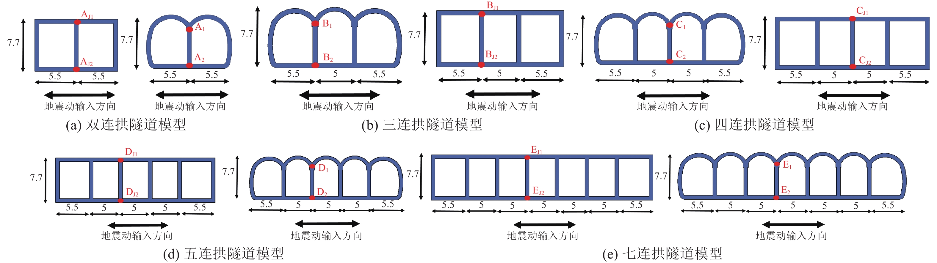 随着工程建设技术的发展及需求的提高,大跨度多连拱隧道逐渐增多,其抗震性能值得关注。本文以某多连拱隧道为依托,建立二维计算模型,采用等价线性化模型Davidenkov模型考虑土体非线性特性,探讨该类结构地震响应规律。首先将拱形隧道地震响应与等截面矩形隧道的地震响应相比较,分析截面形式对结构地震响应的影响。其次,探讨跨数、奇偶性对浅埋多连拱地下结构地震响应的影响。结果表明:(1)矩形较拱形结构产生更大残余变形;(2)结构的响应随跨数增加而增加,且增加的幅度高达30%;(3)奇、偶数拱结构的动力响应差异不明显。研究成果可为多连拱、大跨度浅埋隧道的抗震设计提供参考。
