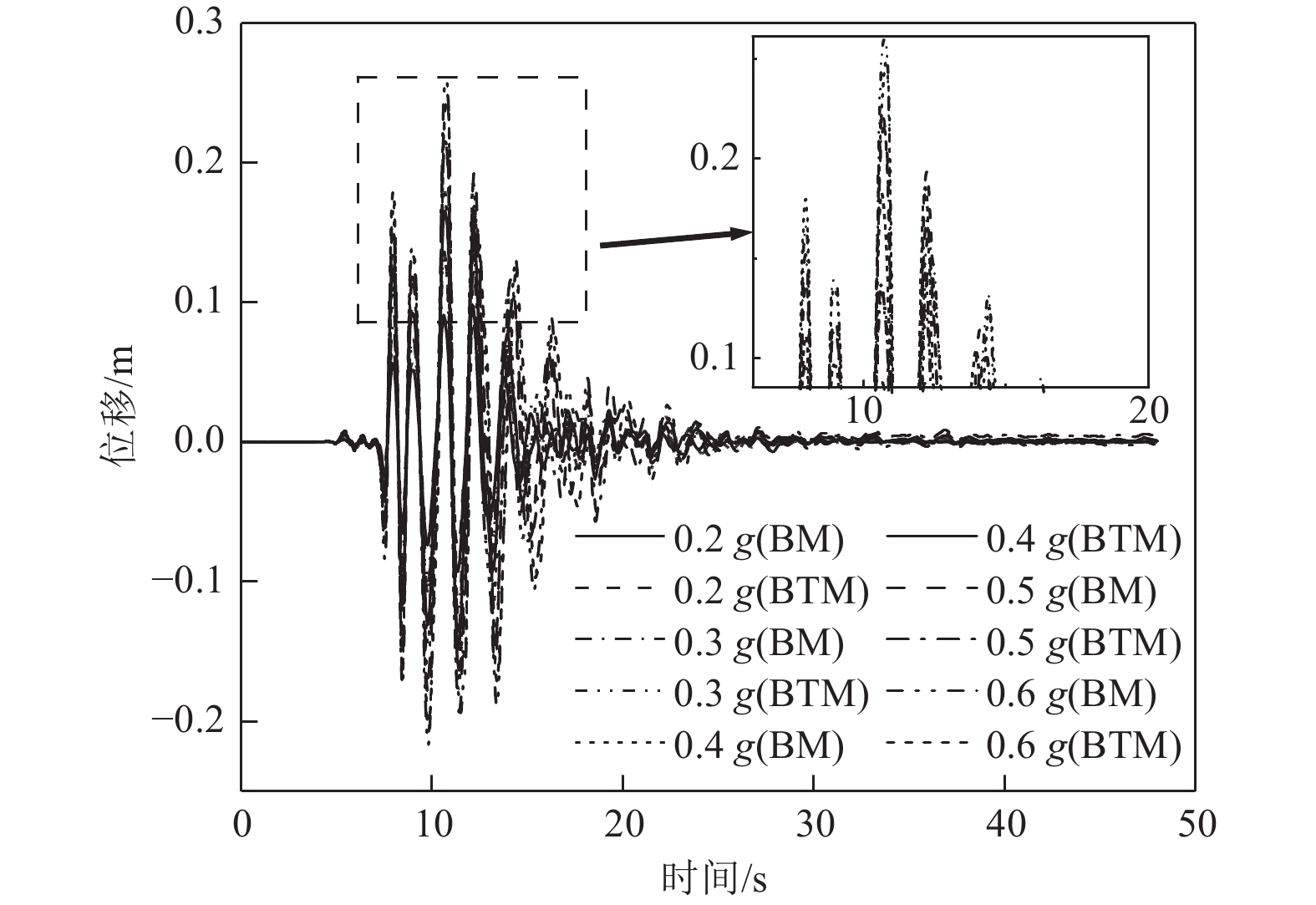 黄土地震滑坡是我国西北黄土高原地区常见且危害极大的地震地质灾害之一。考虑其地震动力响应建立失稳临界位移判据是同震滑坡识别和地震滑坡预警的关键。本文以典型黄土-泥岩斜坡为原型,采用振动台模型试验,输入2008年汶川地震卧龙台、1940年美国帝国谷地震EL台等多种记录加速度波形,分析试验模型(几何相似比1: 10)在0.05 g~0.6 g不同地震加速度幅值下坡体地震动峰值加速度PGA、Arias强度的放大效应,揭示水平地震作用下模型边坡的地震动响应规律;结合坡体宏观变形和加速度与陀螺仪倾角的微观监测数据,分析了斜坡地震变形破坏过程,构建黄土斜坡地震震裂山体和失稳滑动的临界位移判据。结果表明:随输入地震波PGA幅值自0.05 g~0.2 g小幅值、0.2 g~0.4 g中等幅值、0.4 g~0.6 g高幅值的增大,坡体地震动PGA、Arias强度放大系数呈现“先增—后减—再增”的非线性变化特征;整体上坡体地震动放大系数随着斜坡高度的增大而增大,Arias强度放大效应强于PGA,坡体上部Arias强度放大系数最大可达2.1,坡体上部PGA放大系数最大为1.8;坡体表面放大系数略高于坡体内部,小于潜在滑移面附近地震放大系数;基于卧龙台与EL台站记录波形对斜坡的动力响应的影响分析,输入地震波与斜坡场地自振频率的协同作用控制了斜坡地震动响应,当地震动主导频率与斜坡场地卓越频率近似时地震动放大效应最为显著。地震动作用下黄土滑坡为“震裂—滑动”的破坏模式,模型边坡在台面输入0.3 g卧龙波时坡体上部出现微裂隙,0.4 g~0.5 g边坡表面裂纹逐步由细小短裂缝扩展为竖向贯穿的深裂缝,对应震裂山体临界位移为3.5 cm;0.6 g地震波作用下裂缝贯通滑坡并沿黄土和泥岩接触面滑动,对应滑坡失稳临界位移9.85 cm,相应未考虑地震动地形放大效应计算所得黄土斜坡震裂山体临界位移为1.35 cm,地震滑坡的临界位移为4 cm。研究成果有望提升同震滑坡的识别精度和危险性评估定量化水平。