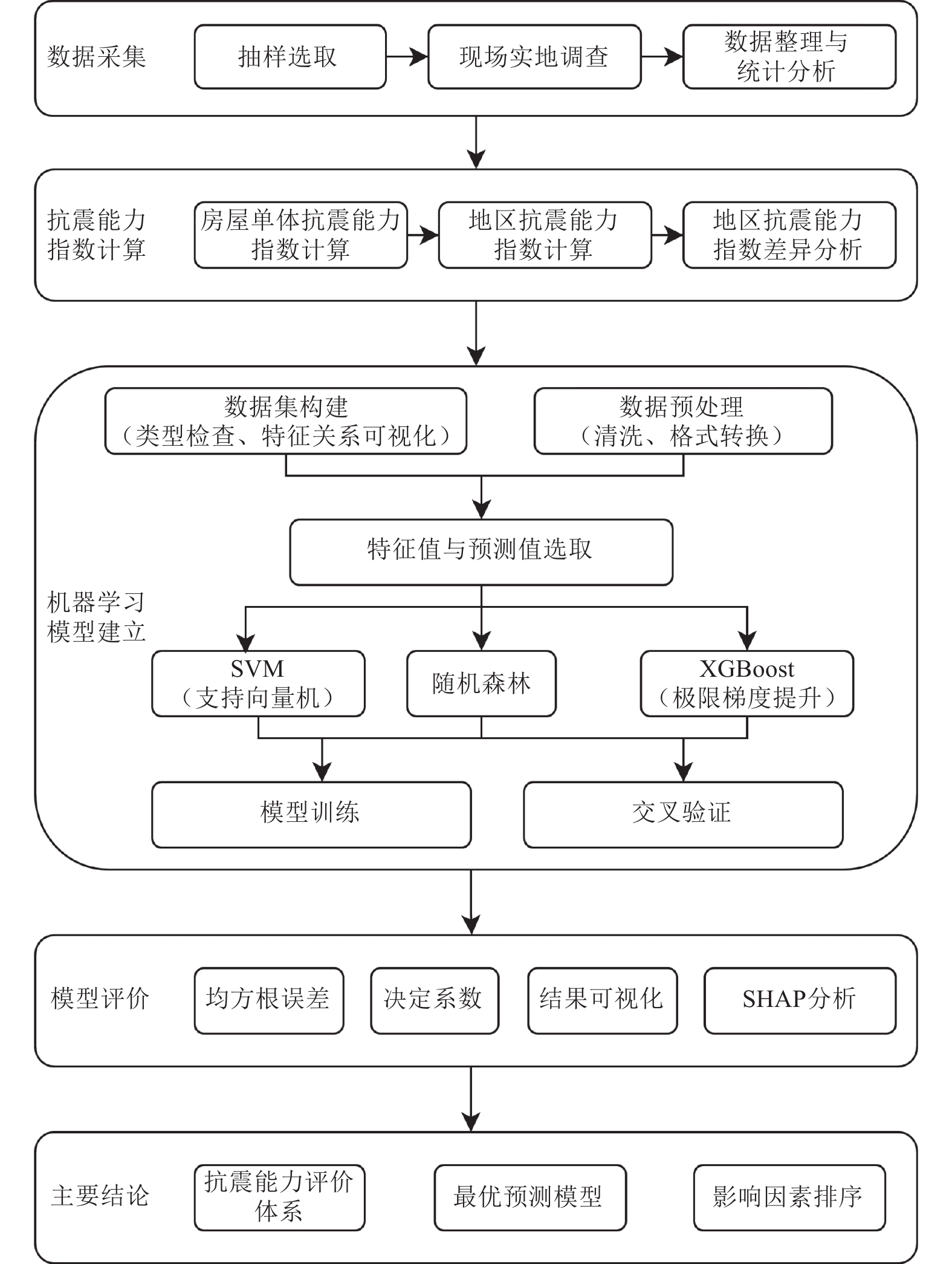 河北省砖混民居房屋存量大且分布范围广,准确掌握其结构特点及抗震能力,对地震灾害评估及应急救援具有重要意义。本文基于对河北省内十个区县2 201栋砖混民居房屋的实地调查数据,总结了河北省砖混民居房屋建造与结构特征,并给出了其抗震能力指数在不同抗震设防烈度下的分布及成因。选取建造年代、横墙间距、房屋宽度、总层数、砂浆种类、有无圈梁、抗震设防烈度和墙体局部尺寸等8个特征值作为输入量。分别采用SVM(Support Vector Machine)、随机森林和XGBoost(eXtreme Gradient Boosting)3种机器学习方法对单体砖混民居房屋抗震能力指数进行预测,并对其预测结果进行分析评价。结果表明,经过超参数优化的随机森林模型预测效果最佳,其决定系数R2达到0.95。同时,通过SHAP分析对8个特征值的重要性进行排序,结果显示抗震设防烈度、砂浆种类和房屋宽度对模型的预测精度影响较高。该模型可实现对单体砖混民居房屋抗震能力的快速评估,研究成果可为河北省民居房屋的地震灾害预评估提供有价值的参考。