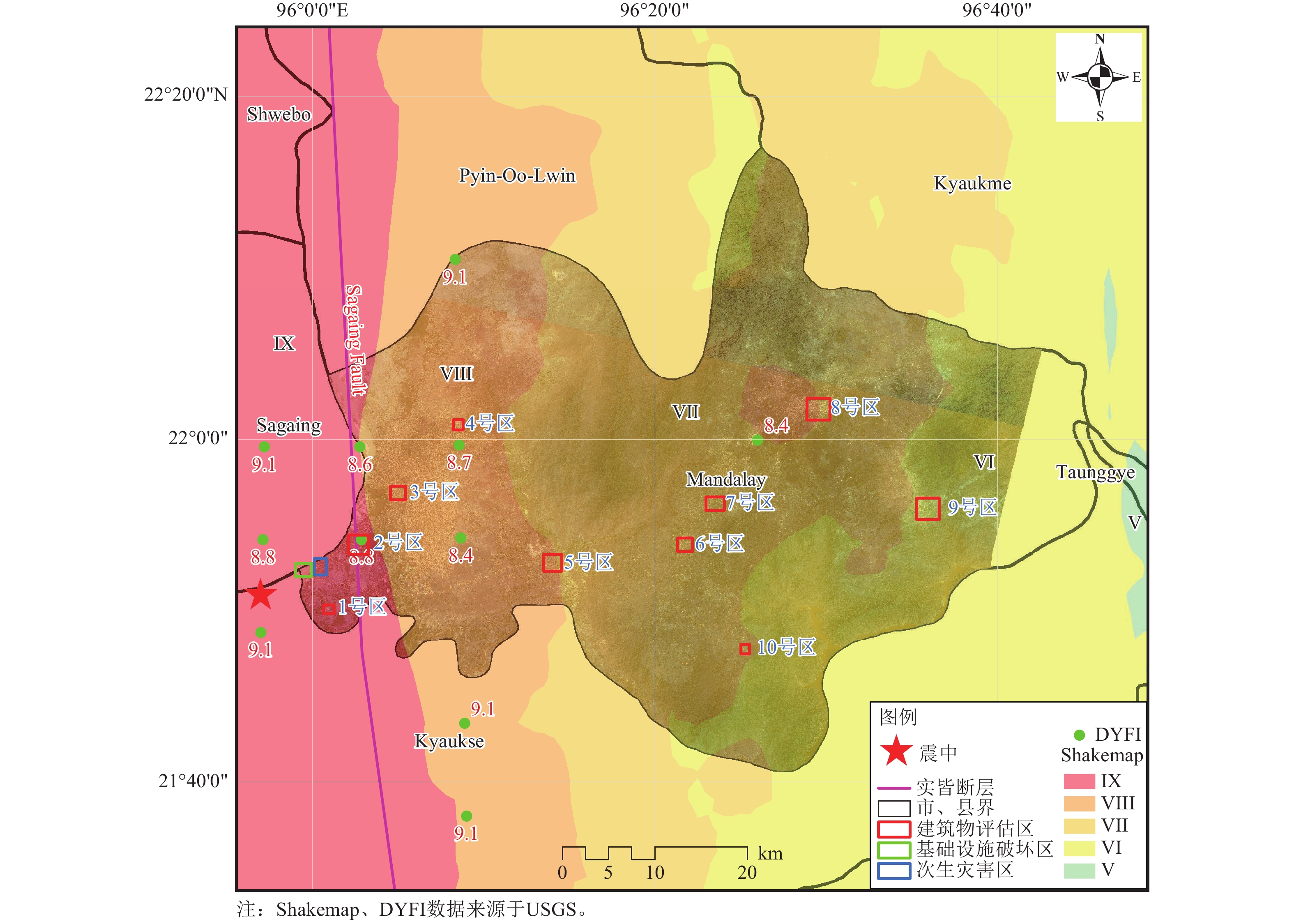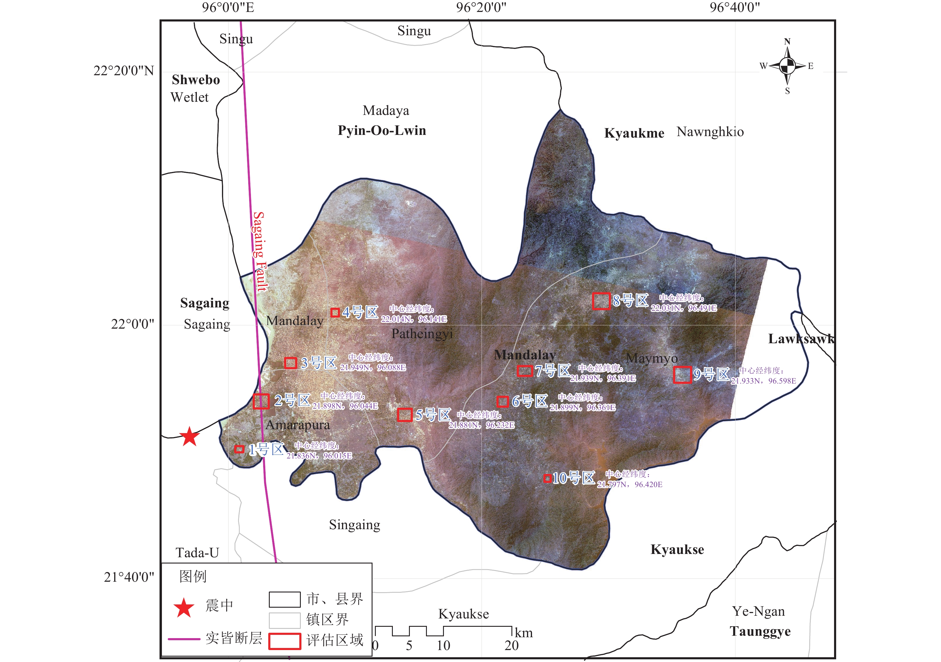 2025年3月28日14时20分,缅甸实皆省(21.85°N,95.95°E)发生7.9级强震,震源深度30 km。此次地震引发了大规模建筑物损毁、地表断裂及次生灾害,造成该国及邻国重大人员伤亡和财产损失。本文以曼德勒市为例,详细对比震前和震后遥感影像,通过目视解译,精细判别了建筑物破坏、重大基础设施破坏、次生灾害等,系统评估了灾害损失和地震烈度,浅析了震害原因,讨论了此次地震的经验教训。结果表明:(1)曼德勒市西部地区遥感震害指数为0.67,预估烈度可能达10度,中西部地区遥感震害指数为0.52,预估烈度可能达9度,中部地区遥感震害指数为0.35,预估烈度可能达8度,东部地区遥感震害指数为0.27,预估烈度7~8度;(2)人员伤亡可能会集中在西部地区和中部地区,东部地区可能会有极少数人员伤亡情况;(3)高分遥感影像为此次地震灾情评估提供了高精度、动态化的数据支撑,评估结果与相关报道基本相符。研究结果有助于判断受灾情况,为震后恢复重建提供科学依据。