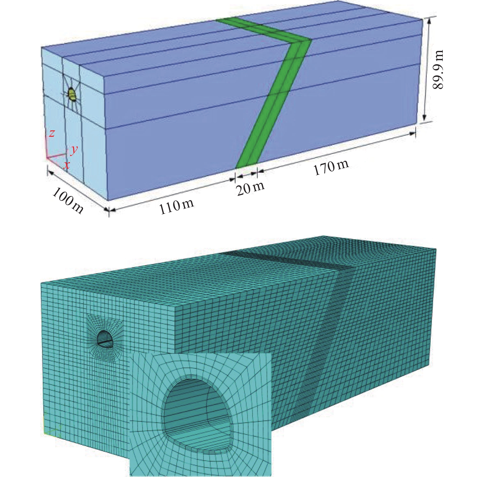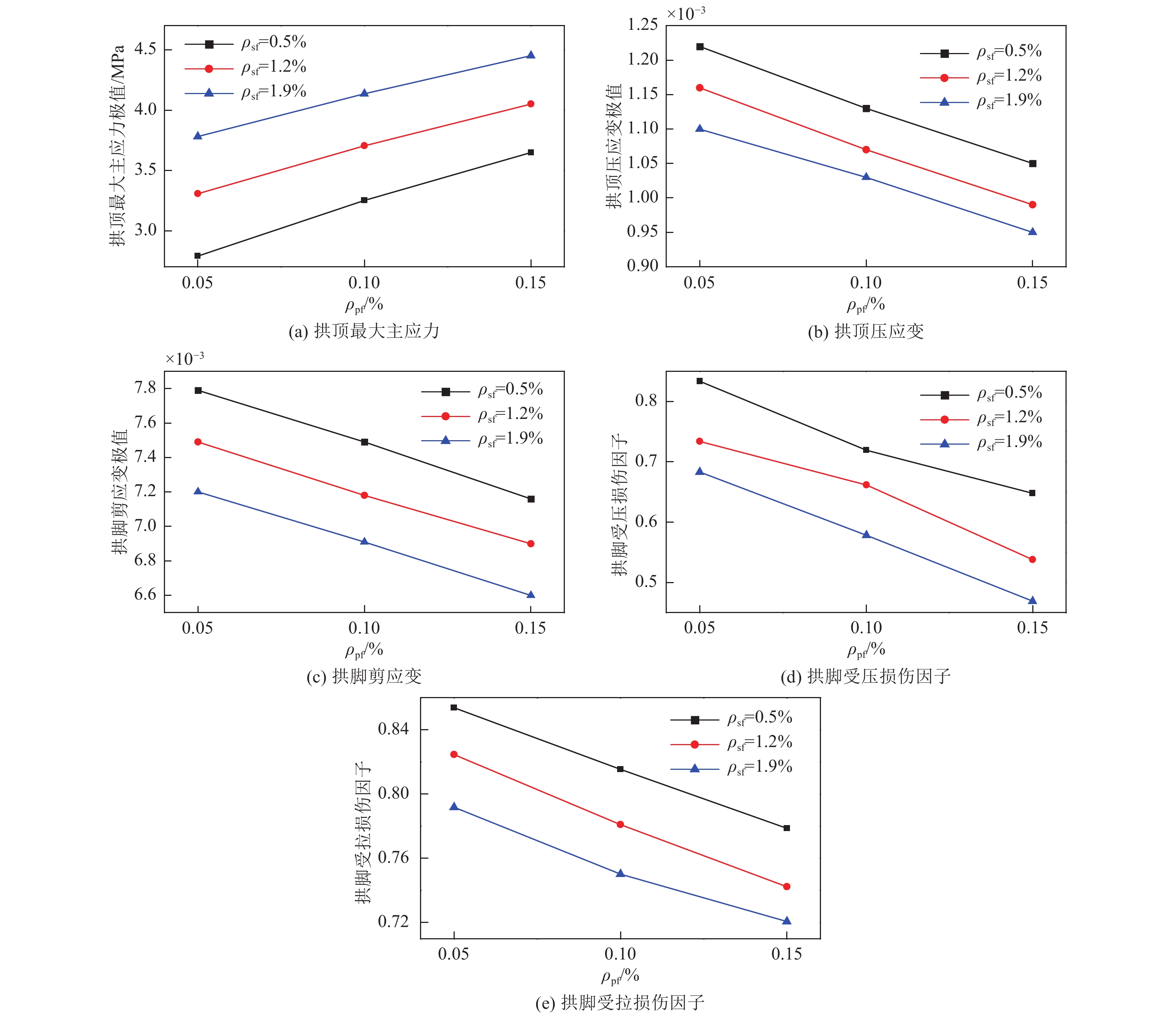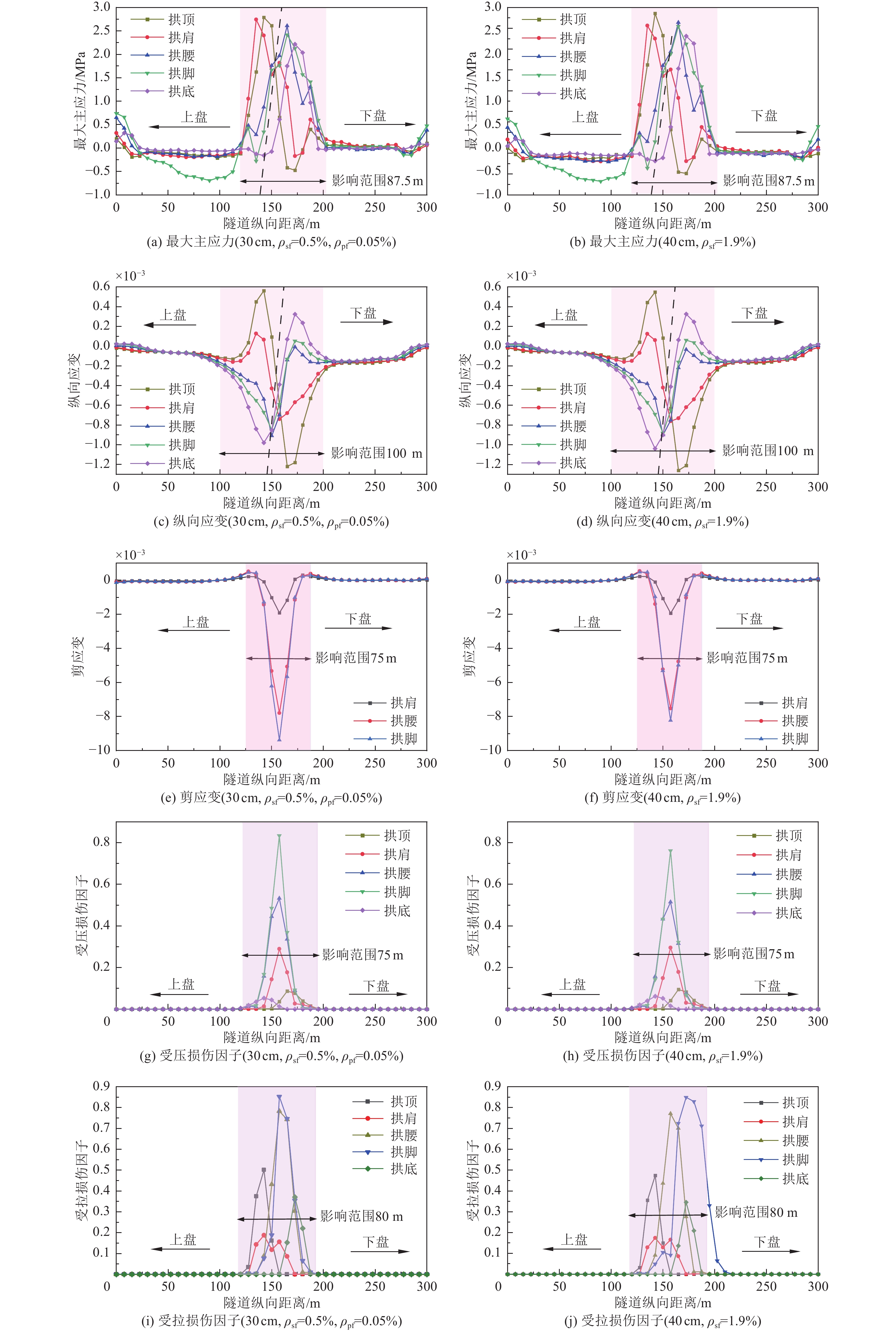 位于断层蠕滑错动地段的隧道存在结构破坏风险,钢-聚丙烯混杂纤维能显著改善混凝土韧性,有效减缓断层错动带来的衬砌裂缝延展,但相关研究较少。在修正既有钢-聚丙烯混杂纤维混凝土本构模型基础上,基于Najar公式计算损伤变量,使用ABAQUS建立跨蠕滑逆断层隧道三维模型,对不同断层错动量下,不同纤维类型、掺量的混凝土衬砌力学性能和损伤开展研究。结果表明,断层倾角为60°时,不同错动量和纤维参数下隧道衬砌的受影响范围均为以错动带为中心的100 m,拱顶最大主应力和纵向应变极值、拱脚剪应变和拉压损伤极值最大;掺入适量纤维能明显增强衬砌力学性能并减少损伤,且混掺效果较单掺更优;混掺纤维时,在一定范围内提高某种纤维掺量能更有效地改善衬砌力学性能和损伤,并削弱拱顶最大主应力、加强拱脚受压损伤对另一种纤维掺量的敏感性;断层竖向错动不超过30 cm时,掺入适量混杂纤维可较好地满足衬砌受力变形及损伤需求,超过30 cm后可结合其他防错断措施。