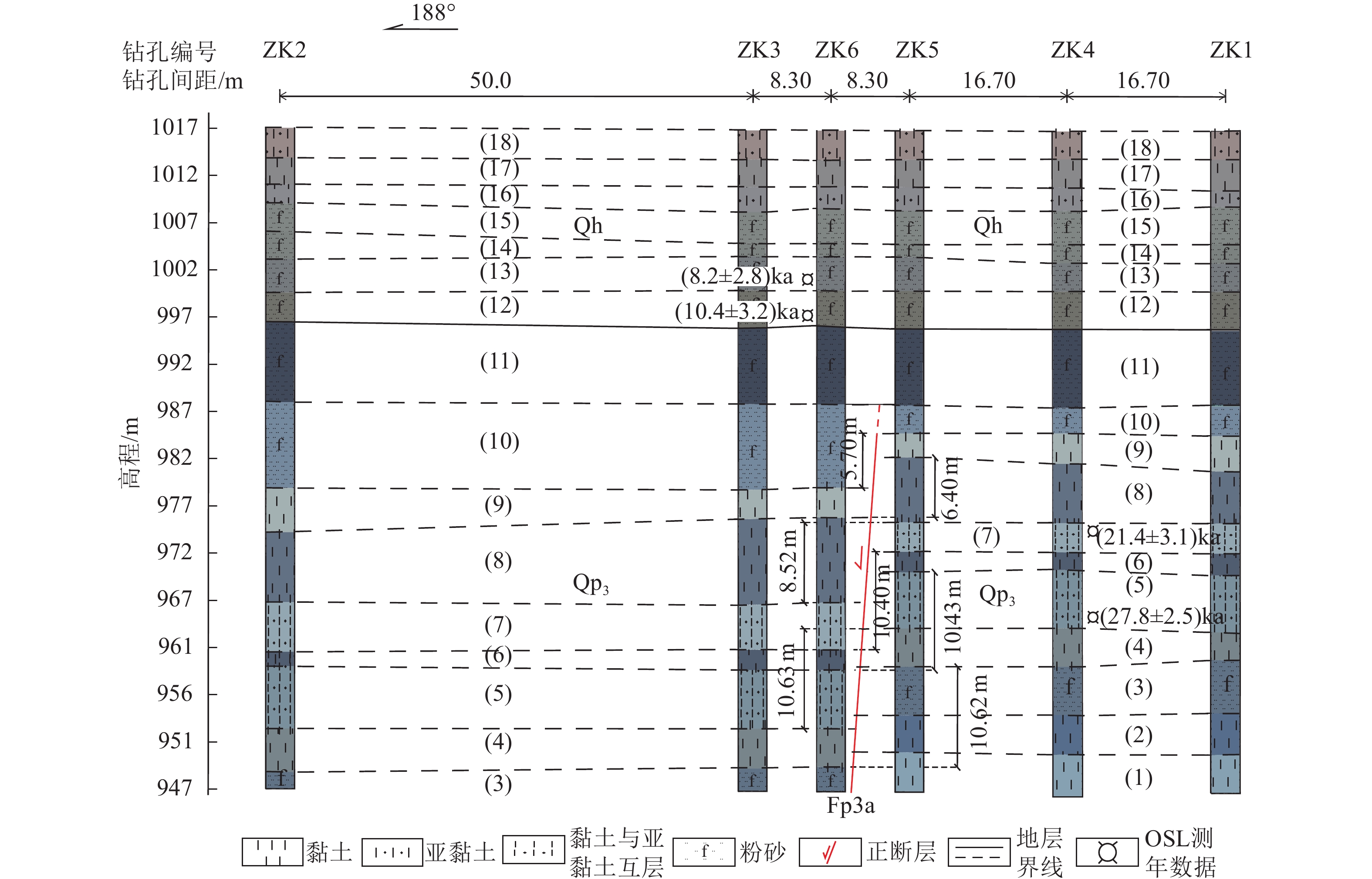 乌拉山山前盆地是河套断陷带的重要组成部分。探明乌拉山山前盆地内隐伏活动断裂的分布和晚第四纪活动特征,对于认识乌拉山山前盆地构造特征和震害防御具有重要意义。浅层地震勘探在乌拉山山前盆地内新发现1条隐伏活动断裂带——三湖断裂带,该断裂带由Fp3、Fp4、Fp5、Fp6断层组成,视倾向南,皆为正断层,其中,Fp3、Fp4、Fp6断层为晚更新世断裂,Fp5断层为中更新世断裂。选取三湖断裂带中经浅层地震勘探确定的上断点埋深最浅的 Fp3 断层上断点,开展钻孔联合地质剖面探测工作,并将Fp3断层修正为Fp3a断层。结果表明:(1)Fp3a断层的上断点埋深为29.0 m,结合光释光年龄数据,断错的最新地层形成于晚更新世晚期,证明该断裂为1条活动断裂;(2)Fp3a断层在晚更新世晚期发生了4次古地震事件,按照由老至新排序,事件Ⅰ、Ⅱ、Ⅲ、Ⅳ的垂直断距分别为1.88、2.12、0.70、5.70 m,说明Fp3a断层在晚更新世晚期活动频度较高,活动强度大。