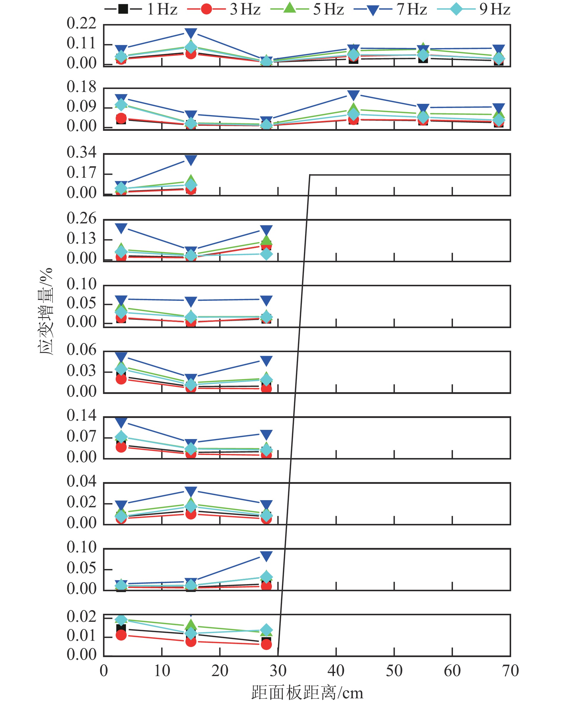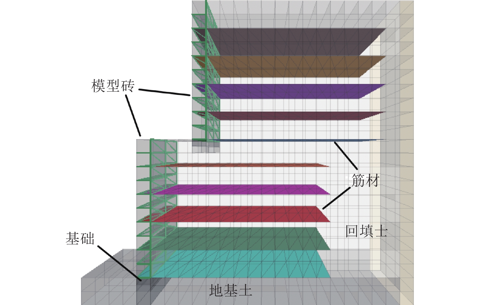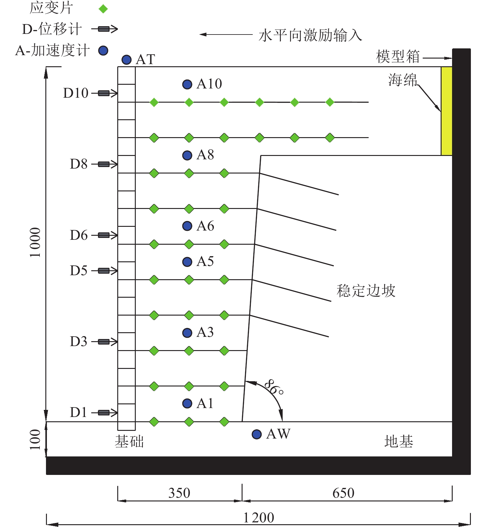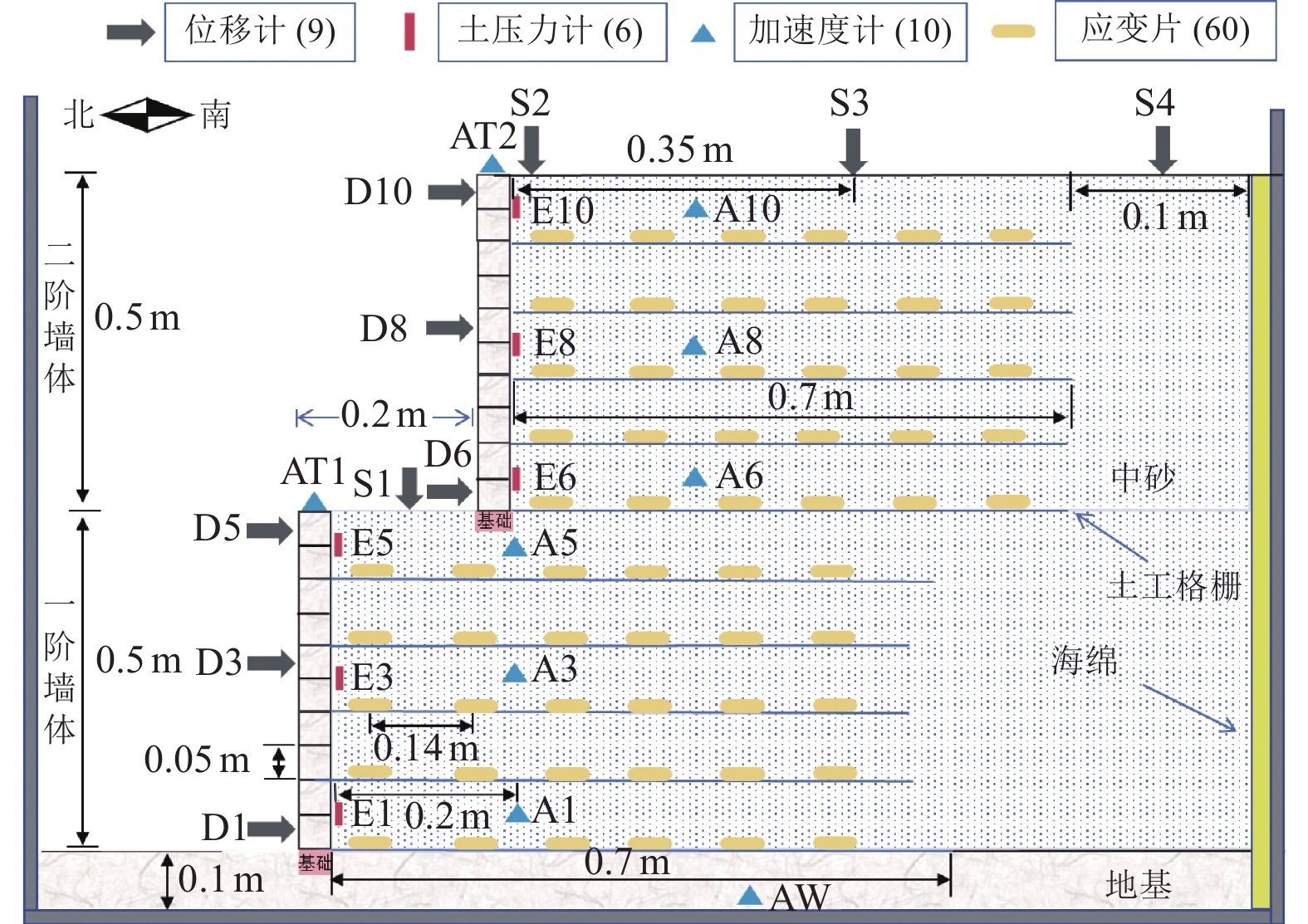 针对施工场地受限和地震频发区域中加筋土挡墙的应用需求,本研究通过开展机械连接式有限空间加筋土挡墙振动台试验,阐述了结构震害现象及墙体变形模式,分析了加速度响应、面板位移、筋材应变、潜在破裂面等力学行为变化特征。研究结果表明,挡墙加速度放大系数随着输入频率增大而增大,并沿墙高呈非线性分布,在墙顶处取得最大值。各工况结束后挡墙累积位移分别为1.09%H、1.28%H、2.05%H、10.96%H(H为挡墙高度),正弦波0.4 g结束后挡墙已发生中度破坏。筋材应变随输入频率增大而增大,并沿墙高呈非线性变化。潜在破裂面由墙趾出发,沿填料与边坡接触面发育;墙后机械连接处是结构薄弱处,设计施工时应进行相应加固。共振会使挡墙位移、筋材应变显著增加,导致挡墙破坏,工程中应避免结构发生该现象。本研究结果可为有限空间加筋土挡墙设计与施工提供参考,推动该结构在地震频发区的建设与应用。