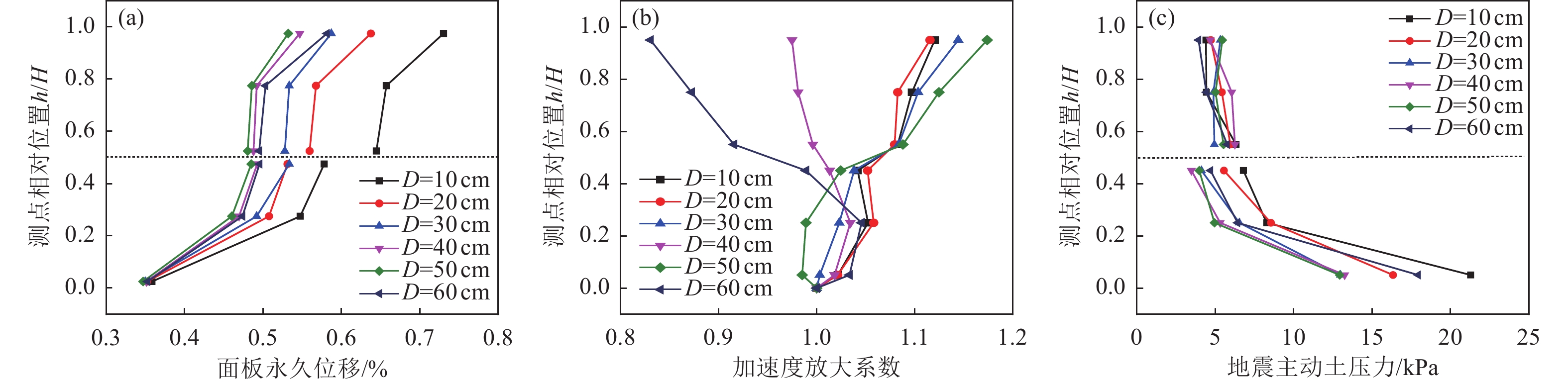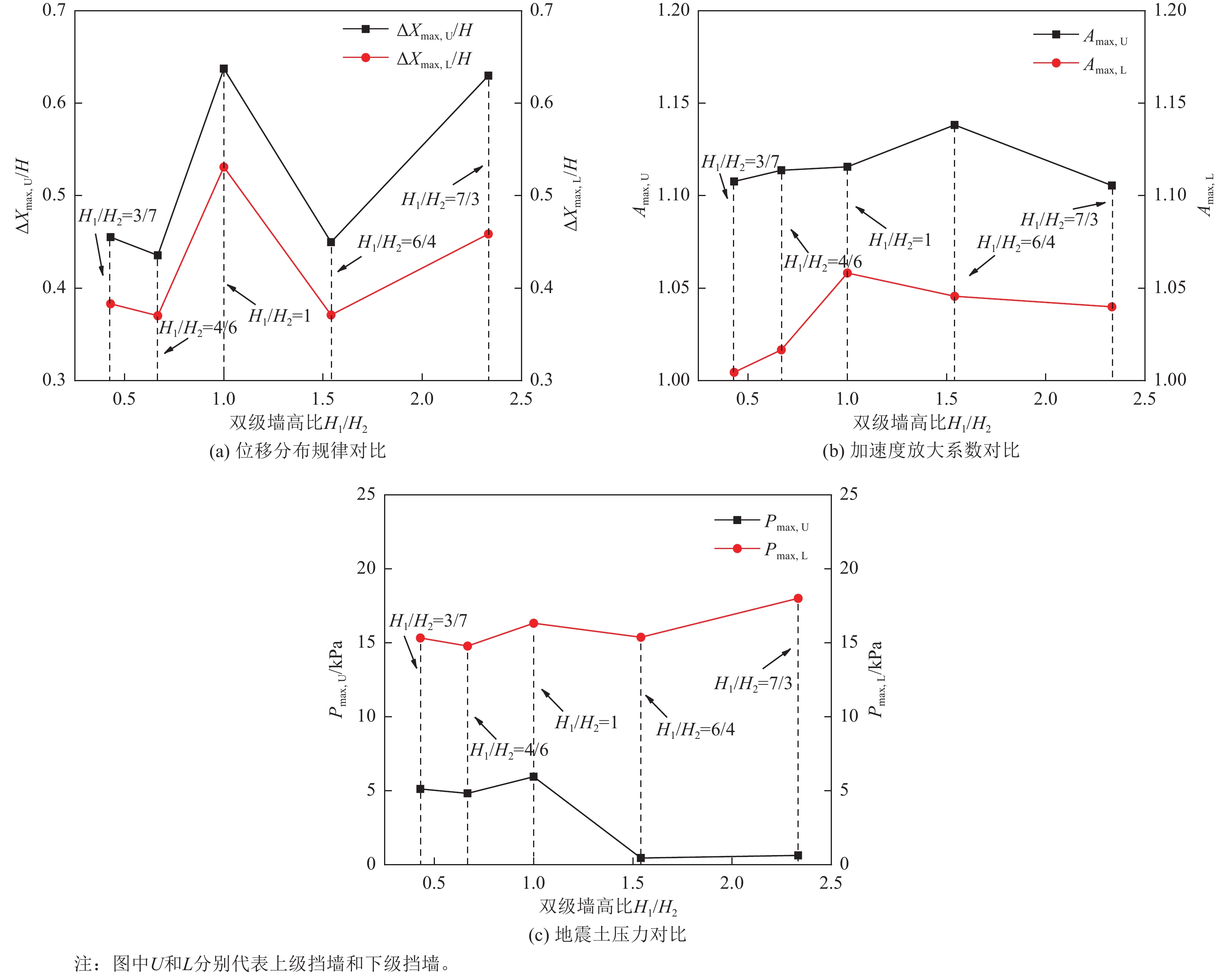 针对地震作用下双级加筋土挡墙临界台阶宽度不明、上下阶墙高选取随意,不利于加筋土挡墙推广应用的情况,基于双级模块式加筋土挡墙的振动台试验结果,建立FLAC 3D数值模型,研究了不同台阶宽度(10、20 、30、40、50、60 cm)、不同墙高比(上下阶墙体分别为3/7、4/6、1/1、6/4、7/3)下加筋土挡墙的墙面位移、加速度响应及地震土压力分布情况。结果表明,面板位移随台阶宽度的增加先减小后增大,最小值出现在台阶宽度为50 cm工况中;加速度放大系数沿墙高非线性递增,上阶挡墙在台阶宽度为40 cm和60 cm时出现加速度响应衰减;下阶墙体土压力在台阶宽度为50 cm时数值最小;上下阶挡墙墙高比为4/6时,墙面峰值位移最小;墙高比为6/4时,上阶挡墙的加速度放大系数最大,墙高比为1/1时,下阶挡墙的加速度放大系数最大;墙高比为7/3时,上阶挡墙的地震土压力值最大,墙高比为1/1时,下阶挡墙的地震土压力值最大。综合分析可知,墙高比为1/1时,临界台阶宽度在50 cm附近;当台阶宽度为20 cm时,上下阶墙体高度应有所区别,不宜均分,也不宜差距过大。研究成果可为双级加筋土挡墙工程设计中台阶宽度和上下阶墙高设置提供数据支撑。